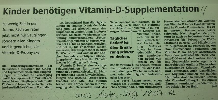 Leider wird die Vitamin D Substitution meist nach dem ersten Lebensjahr beendet, gerade zu dem Zeitpunkt, wo das Immunsystem reifen soll und die Kinder durch das Wachstum ohnehin einen erhöhten Bedarf aufweisen.
