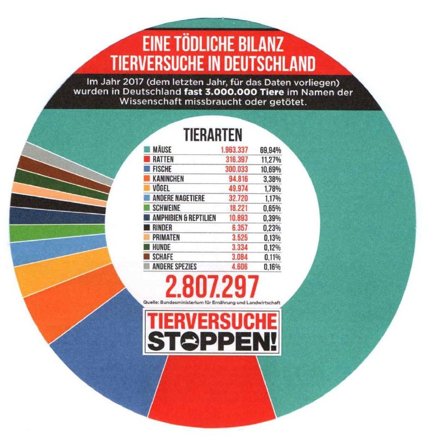 Auf der Grundlage offizieller Daten muss man allein in Deutschland von jährlich 4,5 Mio. Tieropfern ausgehen. Die müssen in grausamen und sinnlogen Experimenten, zu „Forschungsmodellen“ degradiert zum Teil jahrelange Qualen erleiden, um anschließend getötet und wie Abfall entsorgt zu werden.